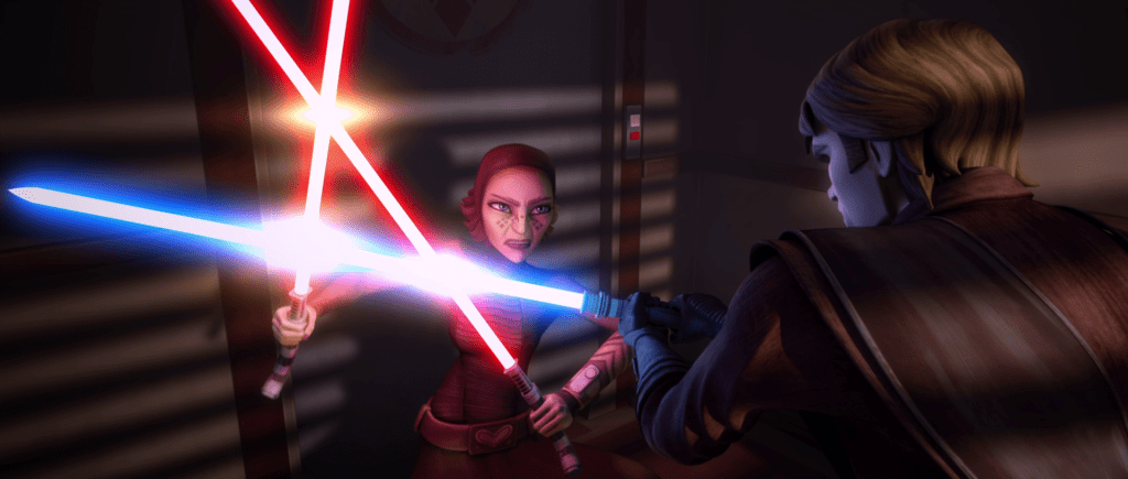 Growing in confidence, Anakin takes a swing at her with his lightsaber (a swing he could easily divert if need be). Still, on edge and not thinking straight, Barriss draws her own lightsaber and parries the attack. Or rather, she draws Asajj’s lightsabers, which she decided to keep after stealing them for her disguise. As she notes with a certain smugness “I think they suit me”.