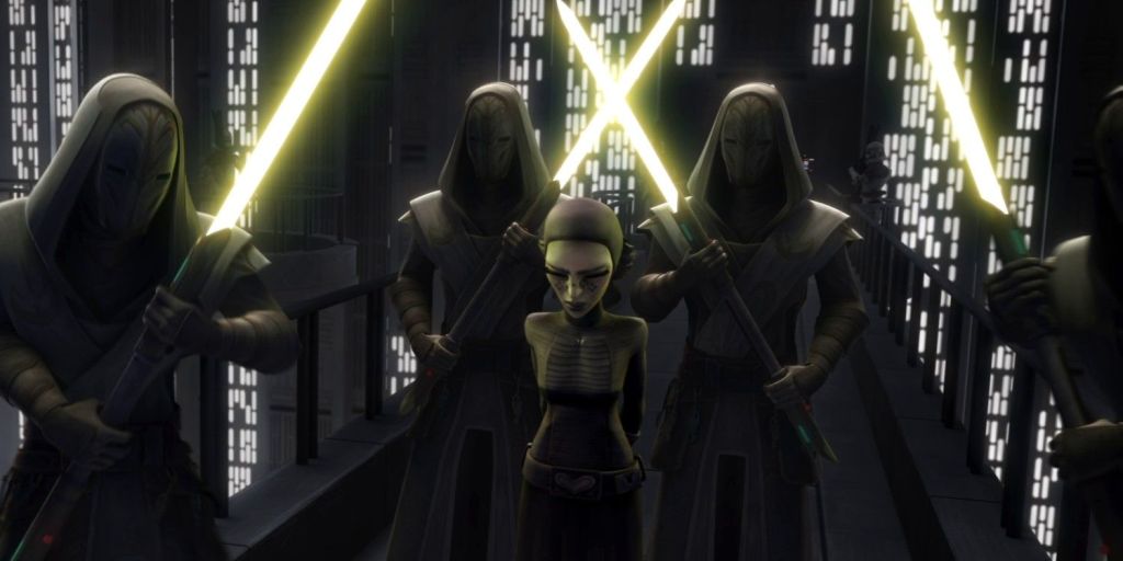 Not knowing Asajj had ever made contact with Ahsoka, Barriss ambushes Asajj, knocking her out and stealing her lightsabers and gear. In the disguise of Asajj, Barriss attacks Ahsoka at the factory, utterly dominating her former friend.