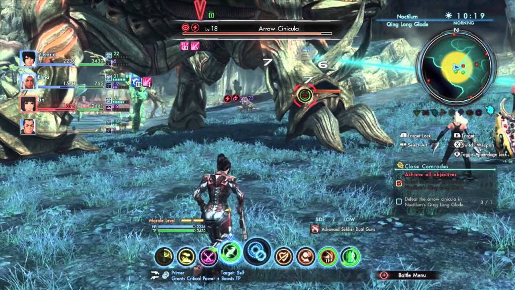 Positioning is even more important than ever, and a handy marker keeps track of your distance from the monster. Some arts are more effective when you have your gun drawn, and some are better with your sword (you carry one melee and one ranged weapon into all battles). Party members might shout out suggestions for moves to each other during battle, and heeding their cries boost your strength and healing. Let’s also not forget TP abilities, double cooldowns, and Overdrive combos!