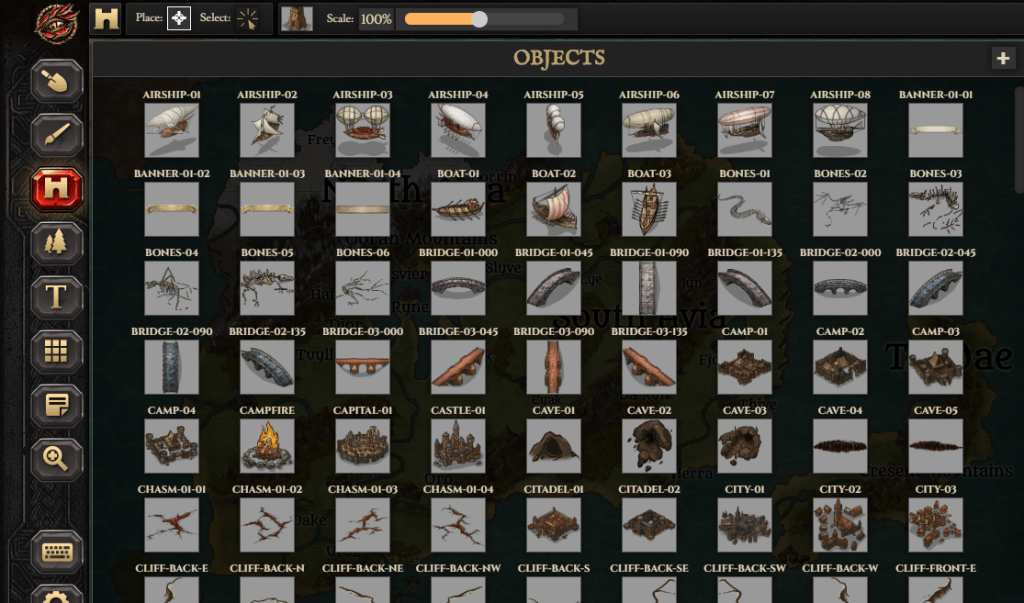 Once you’ve chosen your stamp, you just slap it onto your world just like you would if you were physically applying a stamp. You can alter the color, size, angle, positioning, and visual effects of the stamp, and you can also copy and clone to draw multiple stamps at once (for example, a dense forest or crowded mountain range). With stamps, the landscape of your map comes alive, and you can fill in every last detail of the world in which your story takes place.