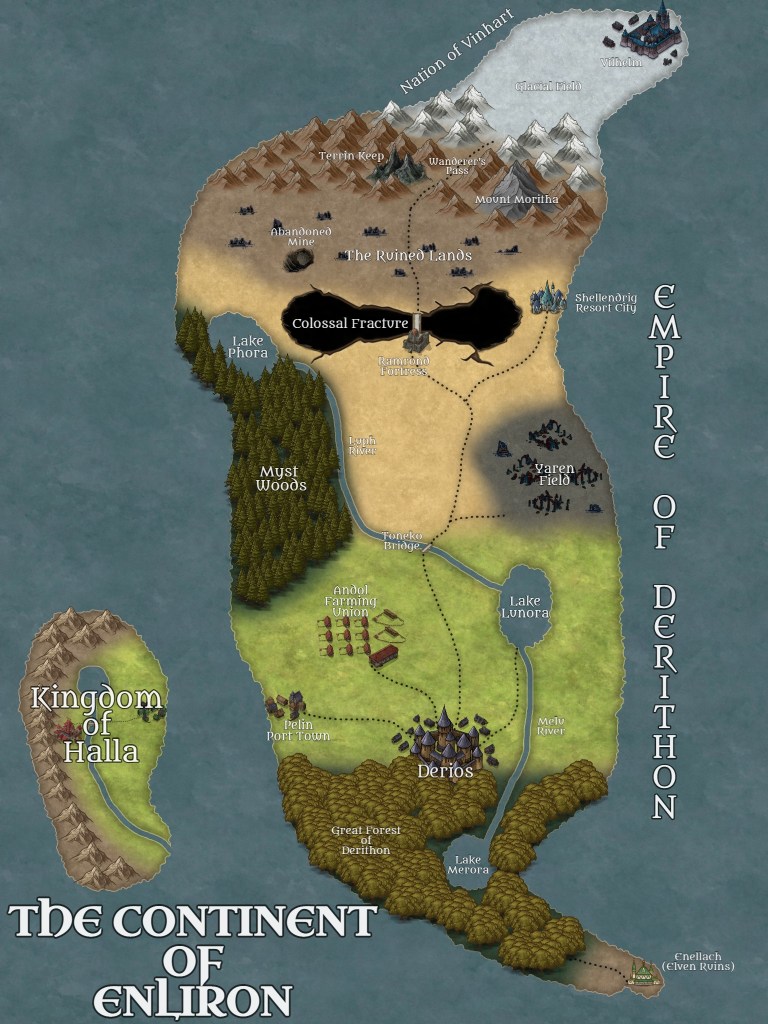 To give a visual reference of what a completed map looks like, why not take a peak at the first version of my own map? This is the world of Enliron, and the setting for my current story, The Struggle for Enliron. If you save the image or open it in a new tab, you can zoom in really close to see all the small details Inkarnate allows you to mess with when utilizing the map-maker.