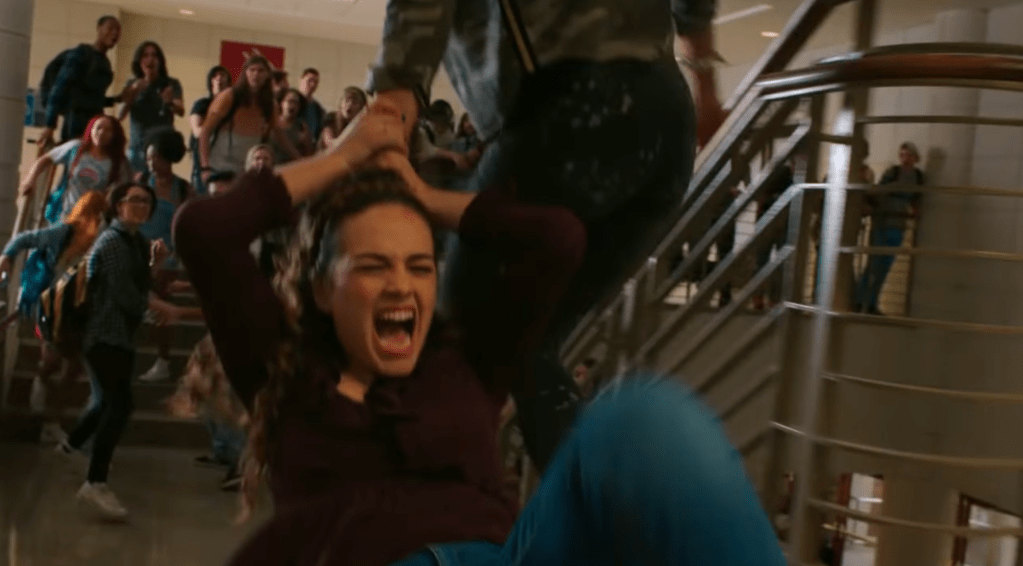 Robby slams Tory against a locker to get her to stop. Miguel, having just made it to the fight, sees Robby manhandling Tory and lunges to her defense, tackling Robby. Nearby students on both sides of the dojo rivalry spring into action, spurred on by the chaotic energy. The unforgettable school brawl has begun. Teachers are useless. Students are merciless. It’s chaos.