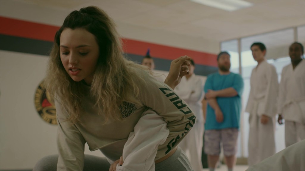 Her showdown with Sam is brutal, with Sam on the receiving end of most of the beatdown. Though Miyagi-Do practices defense, it also requires balance, and Sam’s balance has been utterly destroyed by Tory dumping out her colossal drunken mistake for all to hear. Tory, meanwhile, leans hard into the aggressive teachings of Cobra Kai to beat the heck out of Sam, until finally Robby is prompted to intervene.