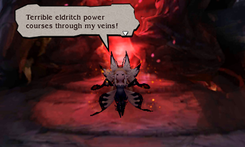 The side quests (of which there are many) are similarly engaging and exciting, and also exceptionally dark in tone (if not straight up depressing). In fact, Bravely Default is consistently oppressive and dark, to a startling degree. This is a violent game, and “happy” is about the last word I’d use to describe it. It isn’t so dour that it crushes your soul just to play, and the game knows when to loosen up for some tension reliving scenes, but it’s an impressive level of commitment to grounded realism for a fantasy JRPG.