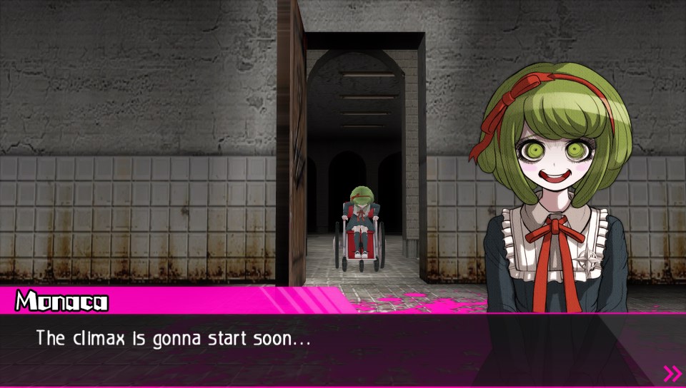 …only to find a bloody mess of remains, a rotting stench, a palpable aura of despair, and the maliciously grinning form of Monaca standing amidst the carnage. With a cheerful lilt, Monaca explains that Komaru’s parents are already dead, and have been dead for the entire course of the game. Everything Komaru heard about her parents up to this point was either prerecorded or fabricated. They died weeks ago, and they died slowly, as Monaca delves into nauseating detail on exactly what she did while torturing them to death.