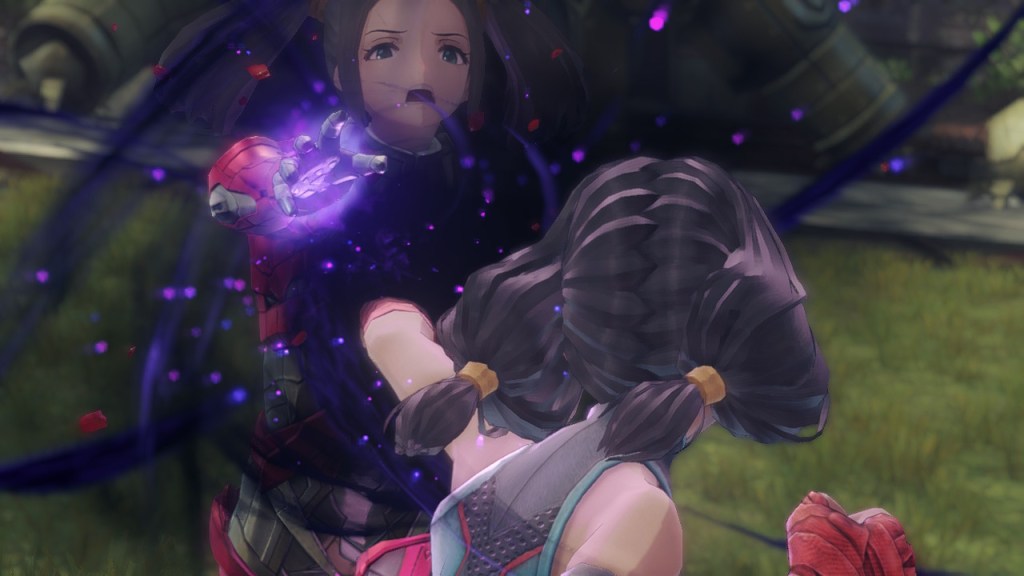 Along the way, Shania does bond with one of the main party members, Sena. She catches Sena in the middle of one of her workouts, and sarcastically quips about the irony of someone with the power of Ouroboros needing to exercise. The unendingly energetic optimist that she is, Sena misses Shania’s sarcasm and meets her with sincerity. Sena explains that she’s doing everything she can to live up to her position on the team, and be a worthwhile member in the eye of her role model, Mio.