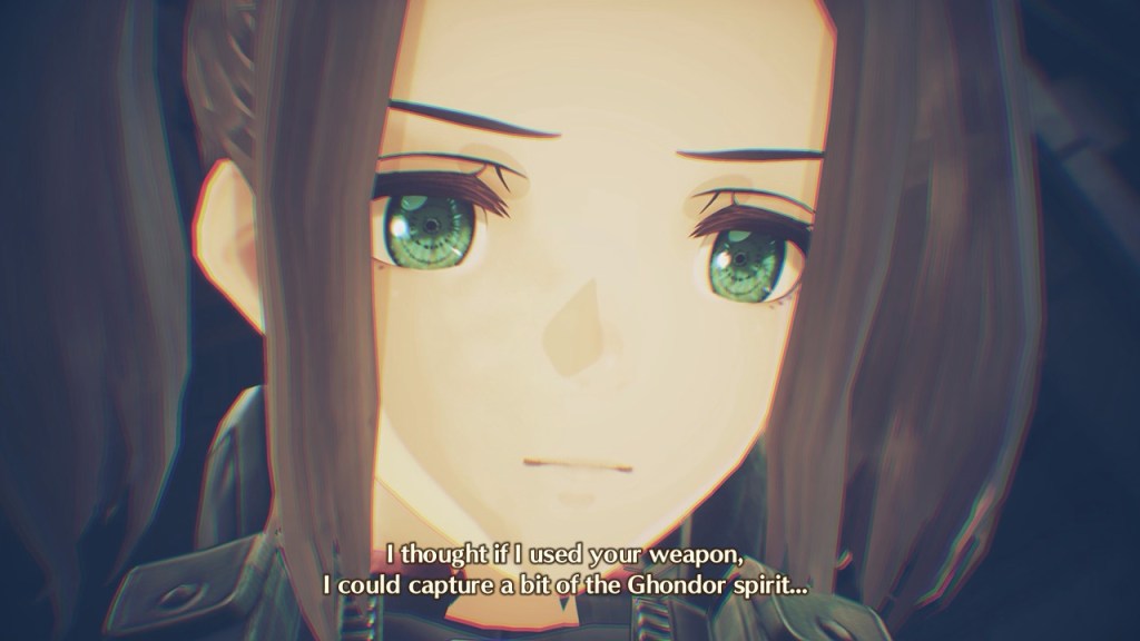 To that end, she begins modeling herself after Ghondor, hoping that even a shred of Ghondor’s courage and strength will pass onto her during the upcoming combat test. She adopts a cockier and more abrasive personality, mimics Ghondor’s apparel, and even begins styling her hair in a way evocative of Ghondor’s recognizable twin tails. Most notably, she adopts Ghondor’s cestus gauntlets as her secondary weapon, even though her thin frame and slight build prevents her from managing them effectively.