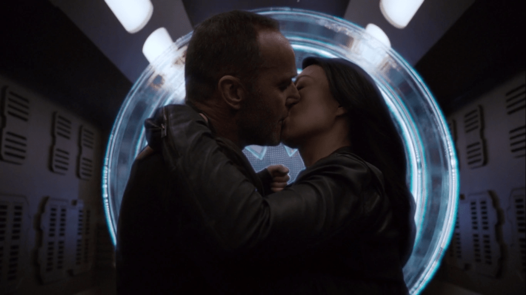 Also, on a lighter note, Coulson and May finally kiss, and it is glorious. There’s a swelling musical riff, and the two kiss while ducking behind Coulson’s shield from enemy blasters. Glorious.
