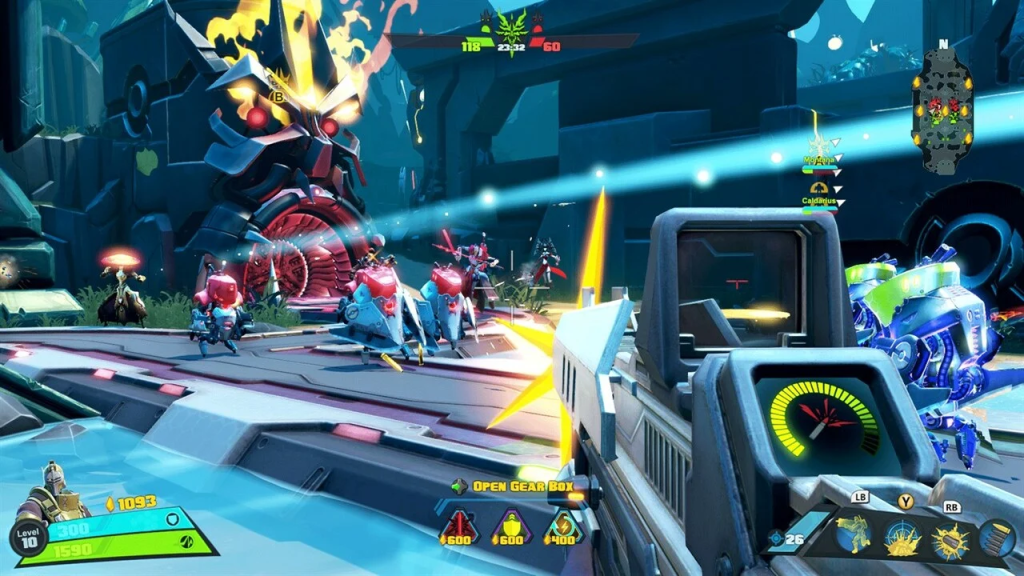 This, as you might expect, takes the shape of a game that is similar to tons of games you’ve played before, but isn’t quite like any one game. You play from a first-person perspective, run around and shoot enemies, use abilities just like a normal Hero Shooter, and take down the enemy team. But, you also level up with experience points while playing and choose your upgrades and perks on the fly, purchase items for your loadout when you die, and escort minions to the enemy base to destroy their tower, all MOBA standards.
