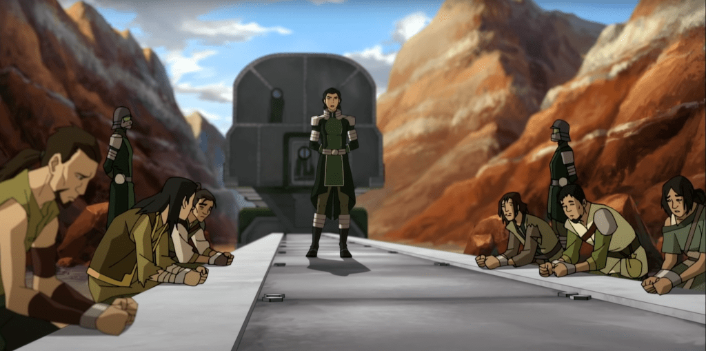 For as much as the citizens love Kuvira, many still refused to acknowledge her authority, bandits and innocent civilians alike. For these people, Kuvira’s army set up re-education camps centered around forcing these dissenters to work. Anyone who tried to stand in her way was sent to these camps and forced to use their bending to mine and mold metal for the machines of war Kuvira’s army thrives upon. Quite a few of these camps exist, and Kuvira often elects to let the captains, sergeants, and commanders in charge of these bases govern them as they see fit, while she turns her attention figuratively and literally forward.