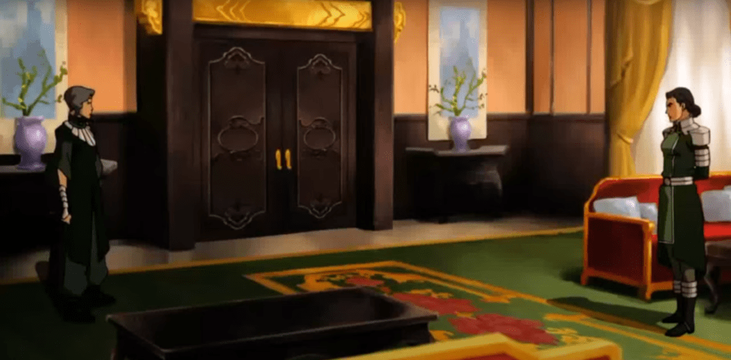Kuvira changes into a fresh attire courtesy of Asami’s wardrobe, wanting to look presentable for her meeting to convince Guan to stand down. Asami watches her like a hawk, and when Kuvira makes a comment wondering why Asami is standing guard here when she could be furthering the inventions of the world back at Future Industries, Asami’s barely-held-together facade snaps in anger.