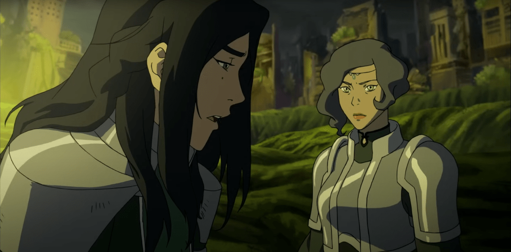 She lashes out at Kuvira, stating that there is nowhere else in the world she’d rather be than protecting her girlfriend from Kuvira, and whatever scheme Asami is confident the cunning ex-general is planning. She warns Kuvira to stop trying to drive a wedge between her and Korra, though Kuvira insists that this wasn’t her intention. She is genuinely intrigued by the close-knit camaraderie that Korra and her friends share, as she realizes this is something she herself has never experienced.