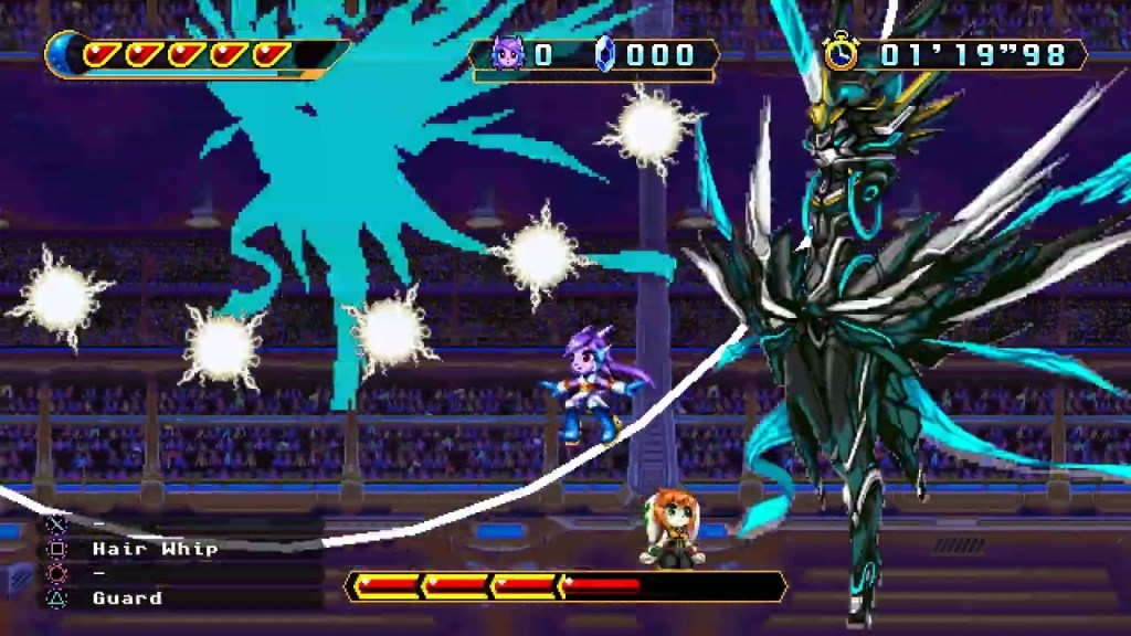After winning, the starship begins to blow up and crash into the ocean. And yet Syntax still gets the last laugh! She manages to send a distress beacon out to Brevon (almost assuredly confirming him as the inevitable Freedom Planet 3‘s main foe), and then she uses her last gasp of power to slam into Lilac and knock her unconscious, which would have left her to die had Merga not leapt to the rescue.