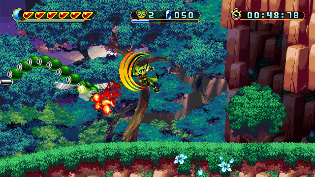 Lilac might have been my go-to in the original Freedom Planet, but I truly cannot stop singing the praises of her feline companion here in the sequel. I honestly don’t think you could argue for any of the other three heroines being better than Carol. She has good aerial mobility with a rising slash and a dive, can climb up any walls, and annihilates opponents with her unending button-hold stream of attacks. And then she gets a motorcycle which makes her the effortlessly fastest character, can ride up walls, and can double-jump. She’s even got a ranged attack with her disc blade which she can subsequently leap to for platforming and fighting antics! She’s got it all, and it’s so much fun!
