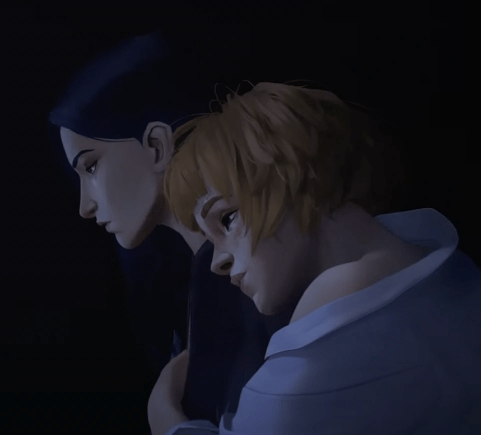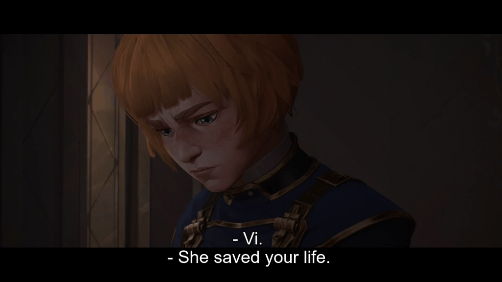 Secondly, I love how from Episode Four onward, we never see plucky-and-ditzy Maddie again. That version of her was just a role, a role she played to perfection, but it was the role intended to win over Vi and push Caitlyn into the position of Commander. Now that that goal’s been achieved, Maddie has a new mission, and that mission is to be sweet and intimate Maddie, the Maddie who sleeps in Caitlyn’s bed and whispers false promises into her ear. I just really like seeing how her personality shifts in this way, and how it’s yet another subtle clue as to her true allegiances far before the actual reveal.