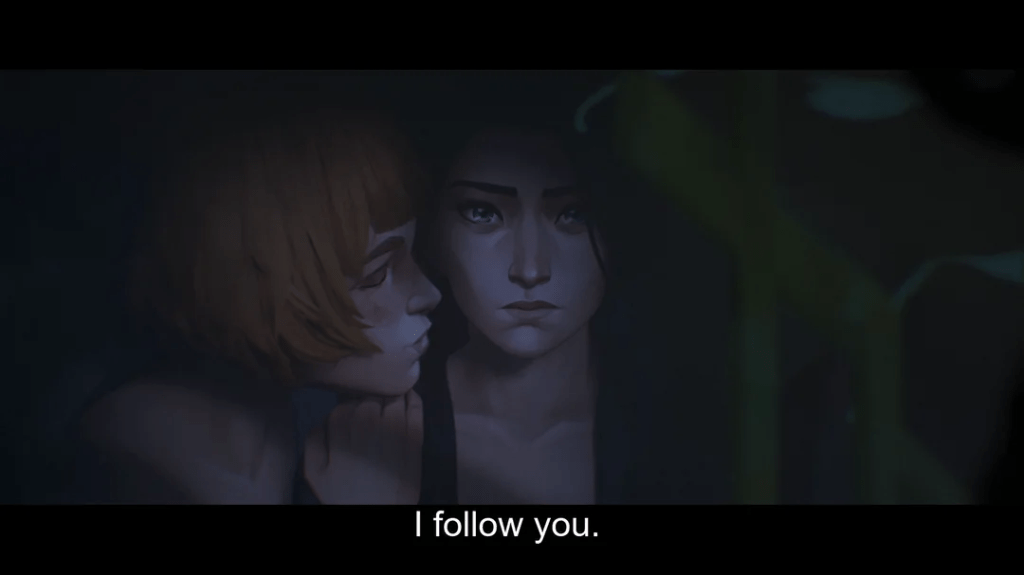 It’s a triple-layered conversation, from start-to-finish. On one layer, we have Maddie testing Caitlyn’s loyalty to Ambessa and her desire to fight the Undercity by calling into question her motivation. On the second layer, we have Maddie painting herself as the wholesome and intimate good guy who will never abandon or betray Caitlyn. And on the third layer, we have the subtle, almost undetectable manipulation of a girl so skilled at getting Caitlyn to dance in the palm of her fingers that even we the viewers need to watch the scene multiple times to see it!