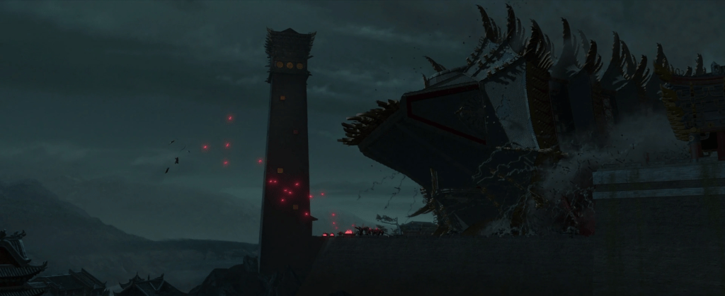 This moment is great, and it gets a special nod from me due to being THE SCENE that first got a younger me to pay attention to movie soundtracks. I can still vividly remember sitting there as a kid, jaw agape, goosebumps from the fusion of music and action playing out before me. I specifically asked my mom to rent this movie for me multiple times just for this scene alone (anyone still remember when Netflix would mail you DVDs?). Anyway, it’s a great scene, that stuns both visually and in terms of the choreography (something this whole franchise nails). Escaping the falling tower by running up it while it tumbles, dodging a hailstorm of arrows and cannons, and then leaping to safety at the last second? As Po himself would say: Awesome.