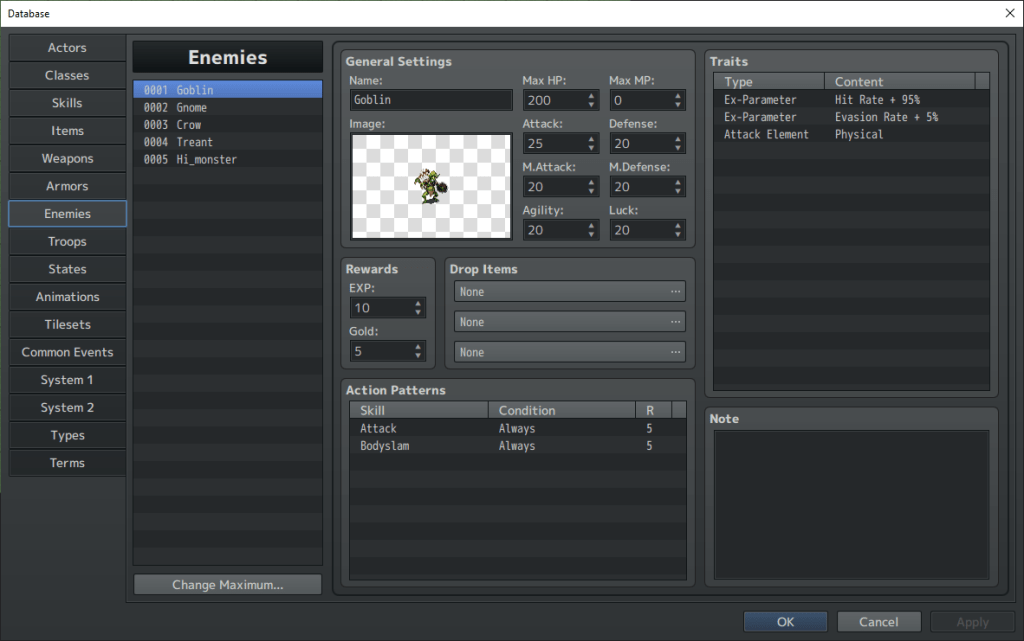 This is the other page you’ll be using a lot of. Because what is an RPG without terrifying enemies and motley mooks to fight? Similar to the “Actors” tab, you type in your own names, pick from the huge selection of available enemy graphics, and then give them stats, traits, and attack moves to your heart’s content! Go wild! There’s so much advanced-level stuff to dig into, but you know what the best part is? RPG Maker MZ comes prepared with hundreds of pre-made moves that you can pick without fuss. Basically, this program tries to make it as easy as possible for you to put together your first-ever game.