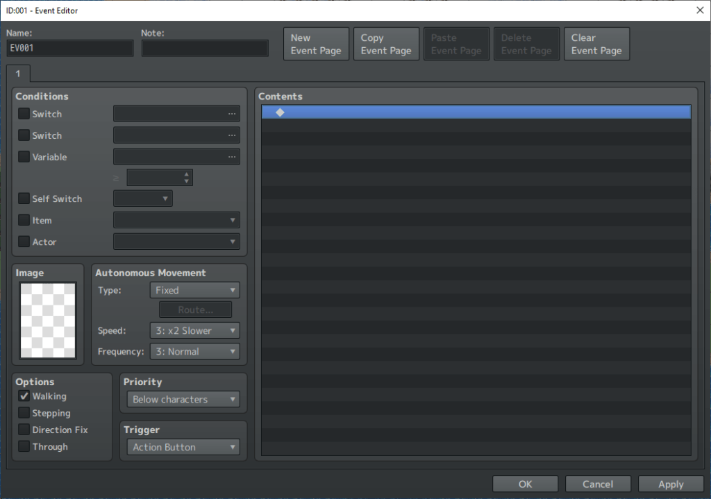 I won’t try to pretend that this isn’t a complicated menu, because it is. Seriously, if you’re going to use RPG Maker MZ, you’ll eventually get to the point where you’ll be spending hours in this menu. Because it’s where basically all the magic happens. It’s how you do dialogue, it’s how you create cutscenes, it’s how you put NPCs into your world, it’s how you create moving objects, it’s how you implement treasure chests, it’s necessary for putting in puzzles…it does so much, and then even more!