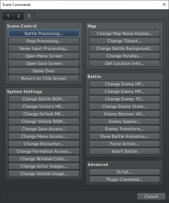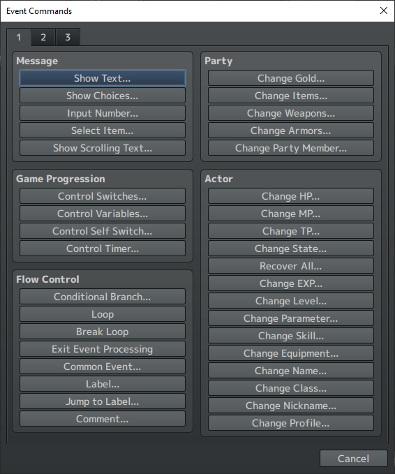 And so this, the “Event Commands“, is what you see when you actually click one of those empty rows in the Event Editor. It’s got three pages. Here’s the first page.