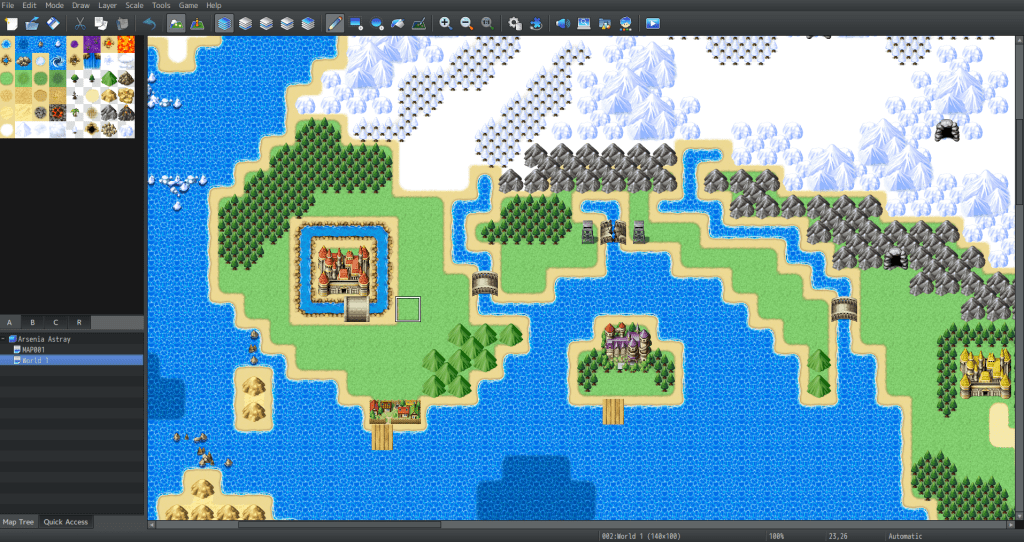 The first thing you’ll see when you boot up RPG Maker is the map screen. As tempting as it is to just start drawing a map, you’ll really want to look into the Database before anything else.
