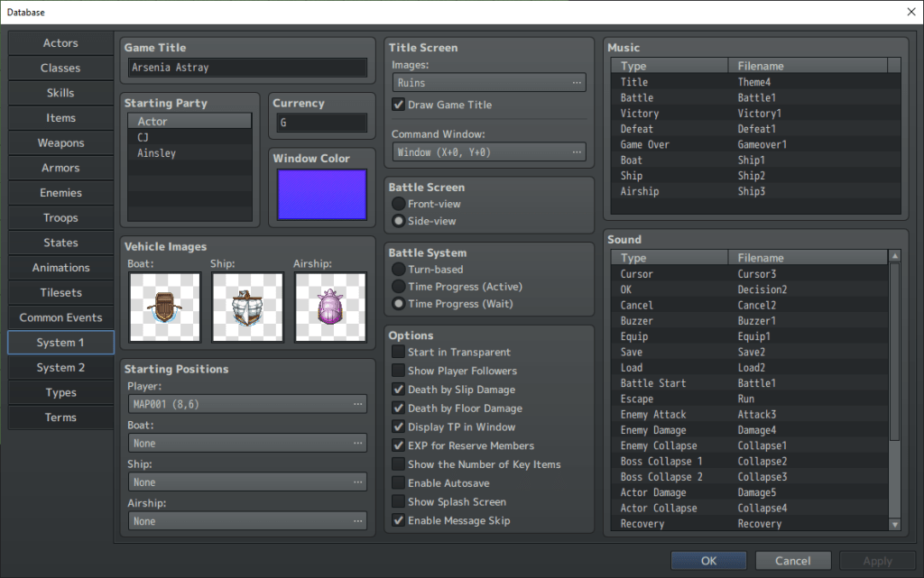 This is probably where you’ll want to begin your journey. Why? Because it’s where you can choose the title of your game! Also, you’re able to decide what the title screen looks like, and you’re able to select specific menu music and sounds (like changing what song plays on the title screen, or what song plays when a battle is won). You’re also able to choose what map your character begins their journey at, and even the color of the border of the screen while the game is being played.