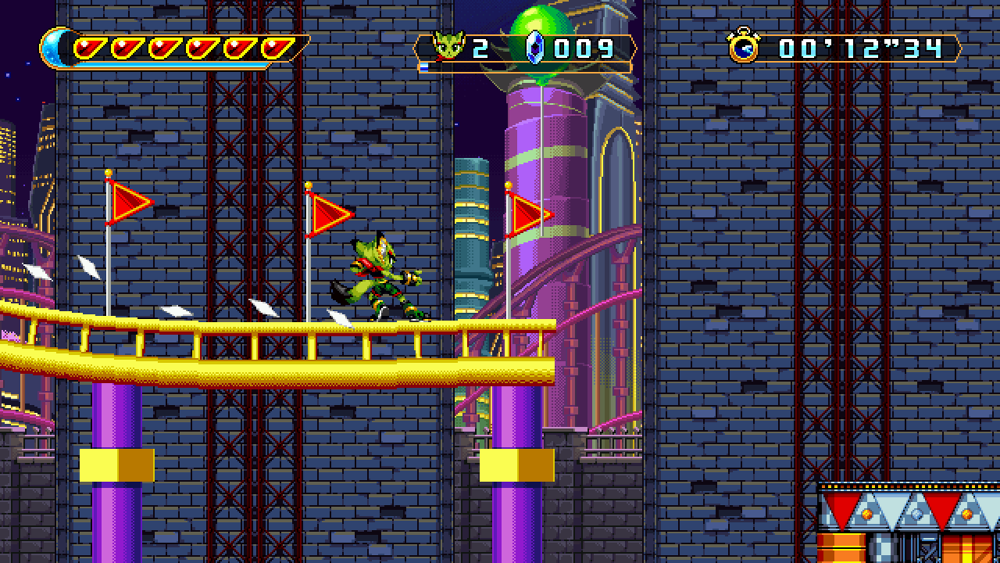 The perfect “hard” level, Shade Armory manages to strike this impeccable gameplay balance of having tricky-but-fair sections, tough-but-manageable enemies, and plenty of moments with speed interspersed with moments of slower precision movement. You’re infiltrating the secret base of the previous main villain, after all, so of course it’d have to be epic! Robotic troops roam the halls, moving platforms make navigation tricky, and there’s a fair bit of back-and-forth pressing switches to progress. And then all the while you’re being hounded by everyone’s favorite evil robo gal, Syntax in some really funny moments. This is a level I adored seeing my skill at completing grow upon many repeat playthroughs, and bashing Syntax at the end of the level is quite enjoyable too!
